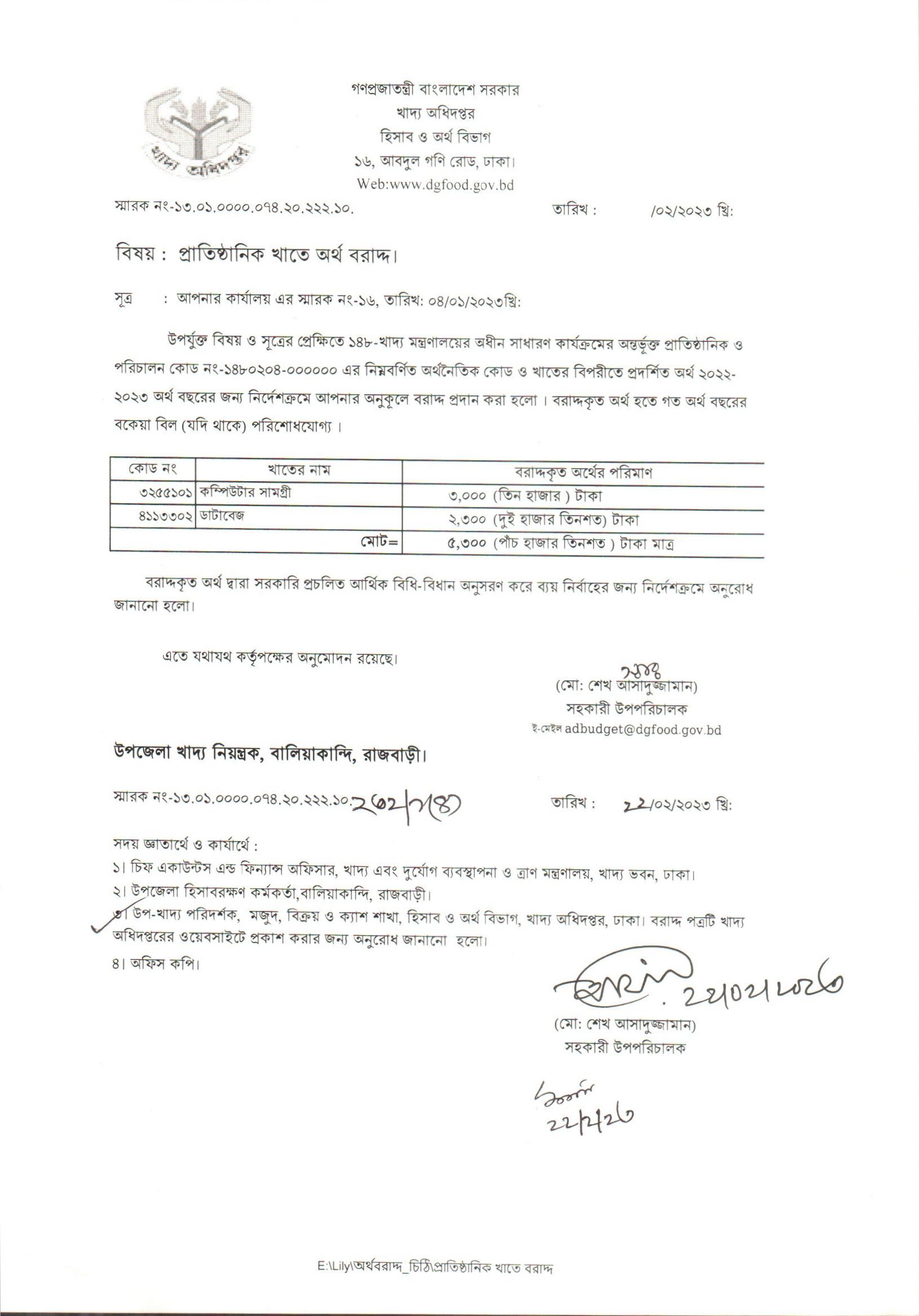 উপজেলা খাদ্য নিয়ন্ত্রক, বালিয়াকান্দি, রাজবাড়ী। নং-৬০ তাং-১০/১/২০২৩