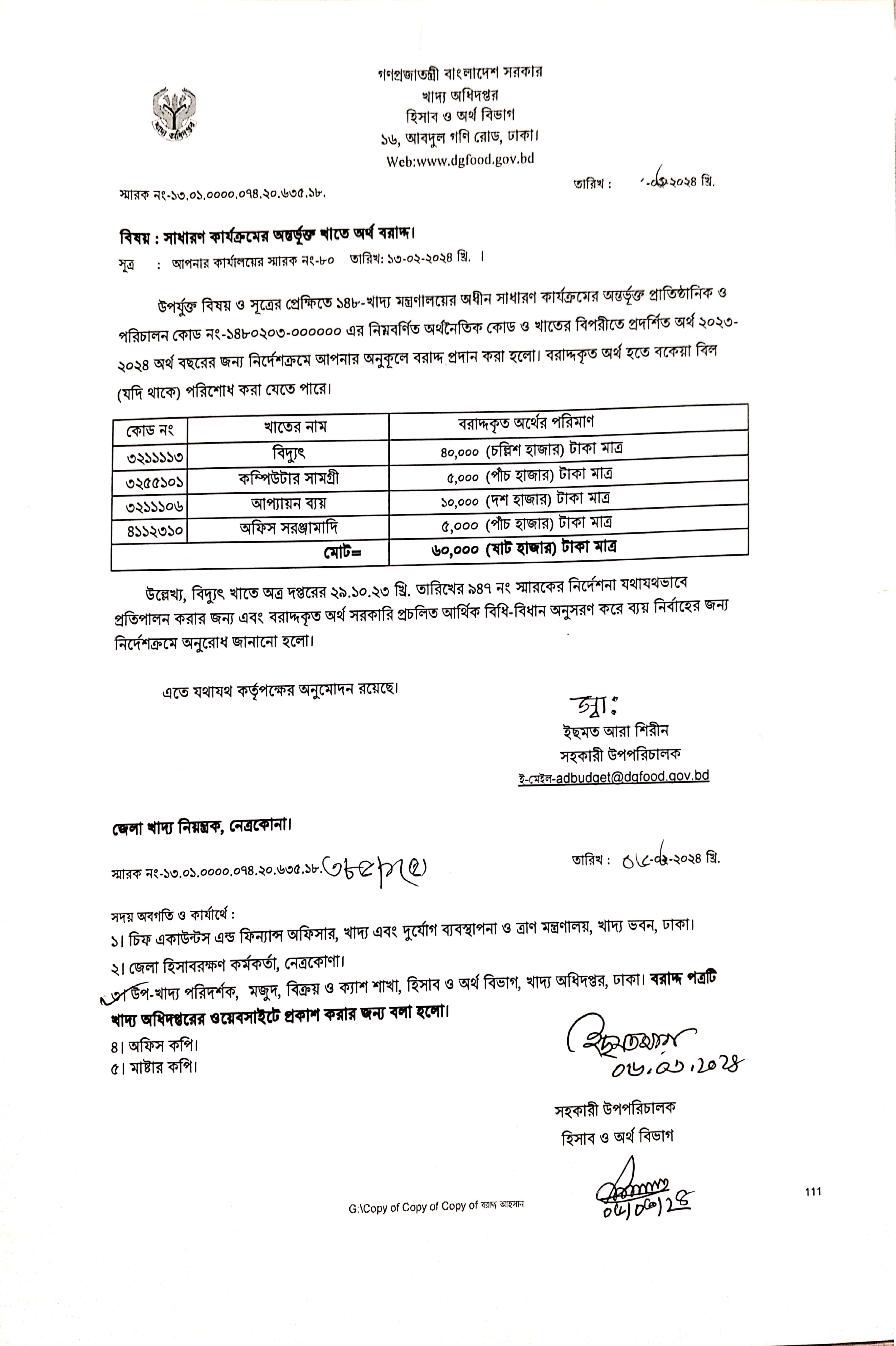 জেলা খাদ্য নিয়ন্ত্রক(সকল)..মুদ্রণ ও বাধাঁইখাতে বরাদ্দ। নং- ৬৩৮, তাং ১৮.০৪.২০২৪ খ্রি.